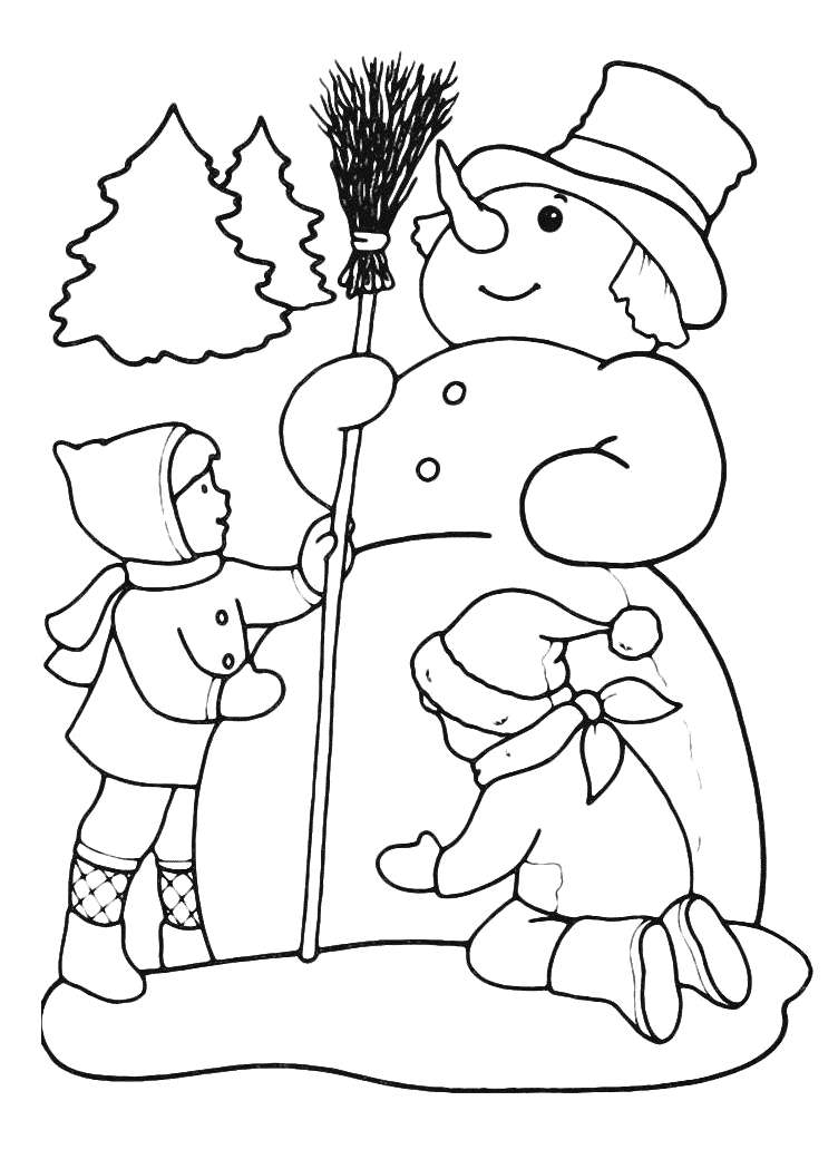 Welcome to our collection of free SNOWMAN coloring pages. Click the illustrations you like and you'll be taken to the download and/or print page. A happy snowman hugging a bird on one arm and holding a broom on the other. Download/Print. An illustration of a boy and his dog building a cute snowman on a snowy day.
