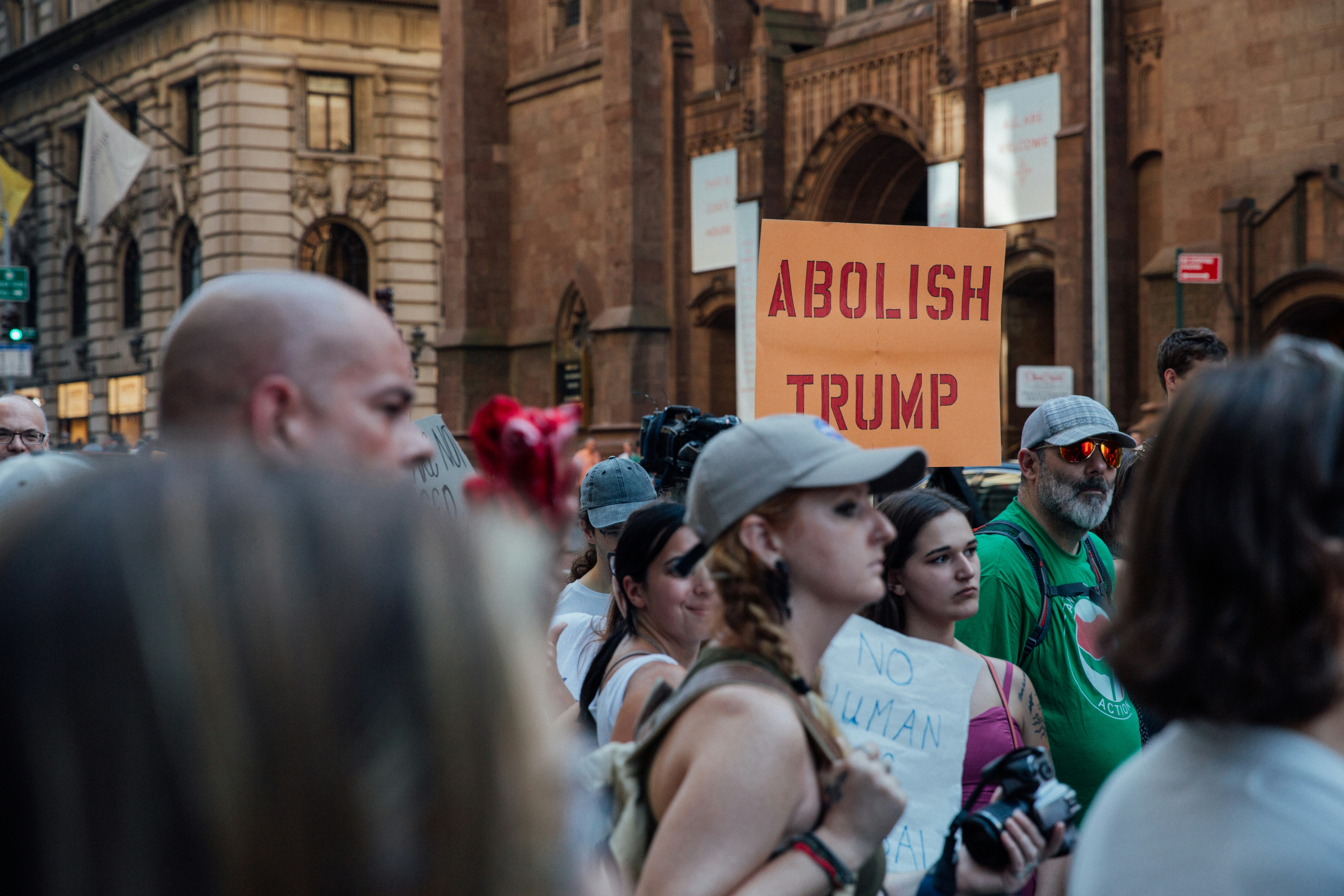 A team of âTrump babysittersâ hold on to the giant balloon of Donald Trump, with thousands of on-lookers.